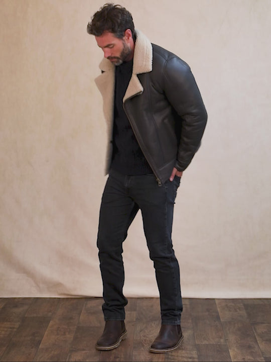 This classic aviator style boasts large panels - a mark of superior sheepskin - along with other traditional pilot jacket features such as an asymmetrical zip and side buckles. Nature's finest insulator also excels in temperature regulation, so you stay comfortable and stylish without overheating.
